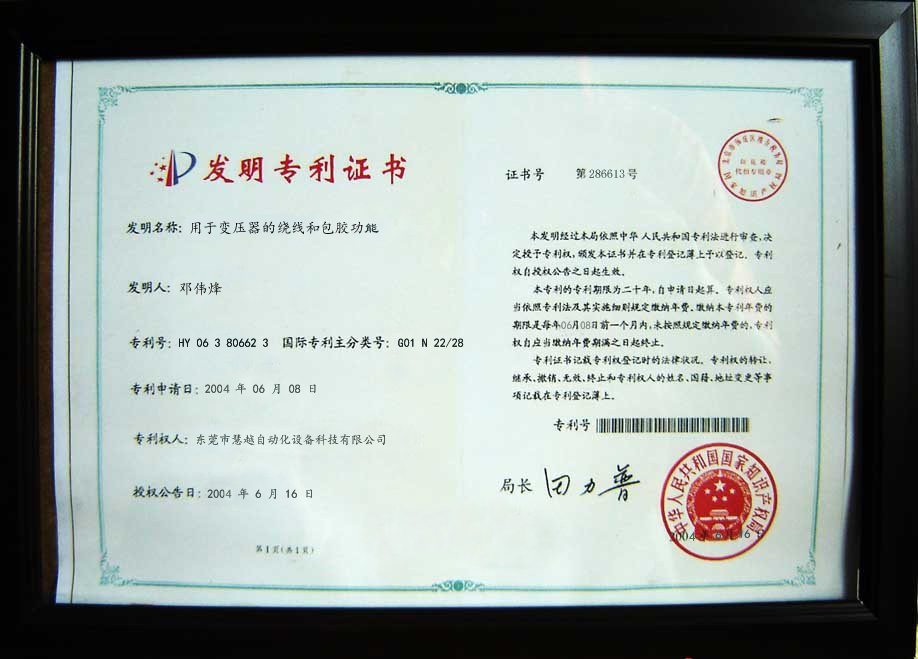 我司東莞市慧越自動化設備科技有限公司專業(yè)生產(chǎn)繞線機行業(yè),科研資金投入逐年提高,不斷加強知識產(chǎn)權保護力度,在2004年獲得全自動繞線機包膠發(fā)明專利證書